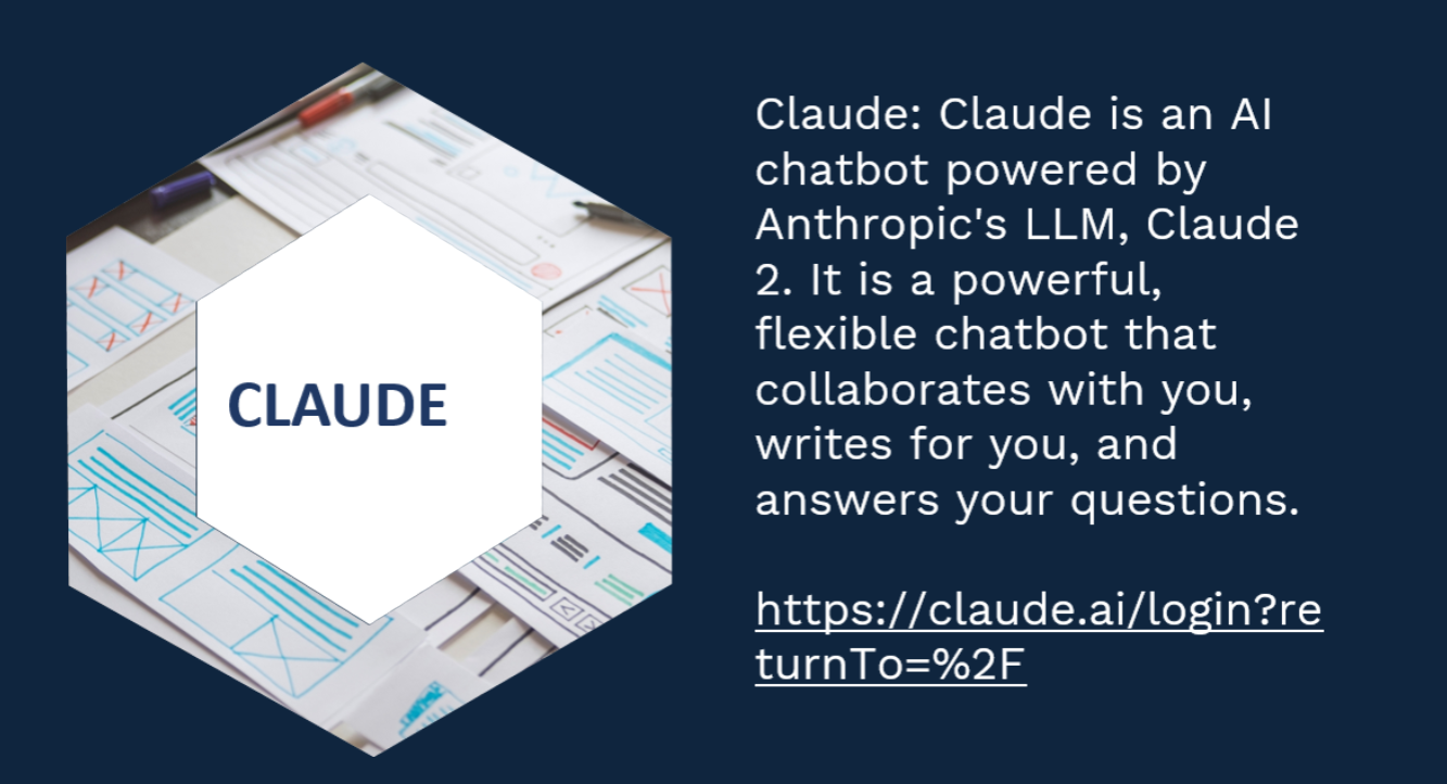 Claude: Claude is an Al chatbot powered by Anthropic’s LLM, Claude 2. It is a powerful, flexible chatbot that collaborates with you, writes for you, and answers your questions.